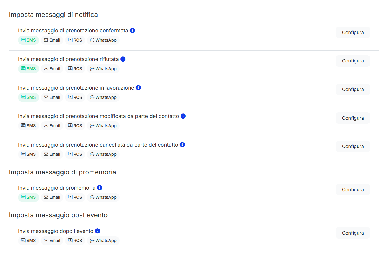 Una delle cose più interessanti della gestione prenotazioni con Smshosting è la possibilità di impostare dei messaggi di notifica, sia via SMS, RCS e WhatsApp che tramite email. Sempre all'interno delle impostazioni del calendario, puoi scegliere di configurare i seguenti messaggi 👇